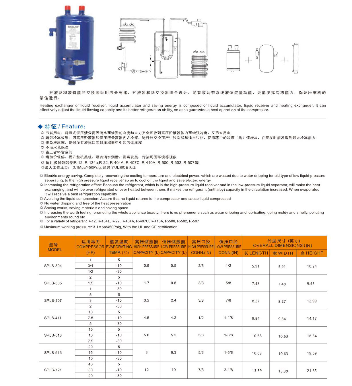 節省用電,將舊式低壓液分離因滴水而浪費的冷度和電力完全回收到高壓貯液器體內而增強冷度,又節省用電。增強冷凍效果,因高壓貯液器和低壓液分離器內之冷媒,進行熱交換而產生過冷卻和適當過熱,使循環中的冷媒(焓)值增加,在蒸發時能發揮到最大冷凍能力。避免液壓縮,確保沒有液體回流到壓縮器中引起液體壓縮。不滴水免保溫。省工省料省空間。增加價值感,提升整機美觀,沒有滴水潤滑,發霉發臭,污染周圍環境等現象。
