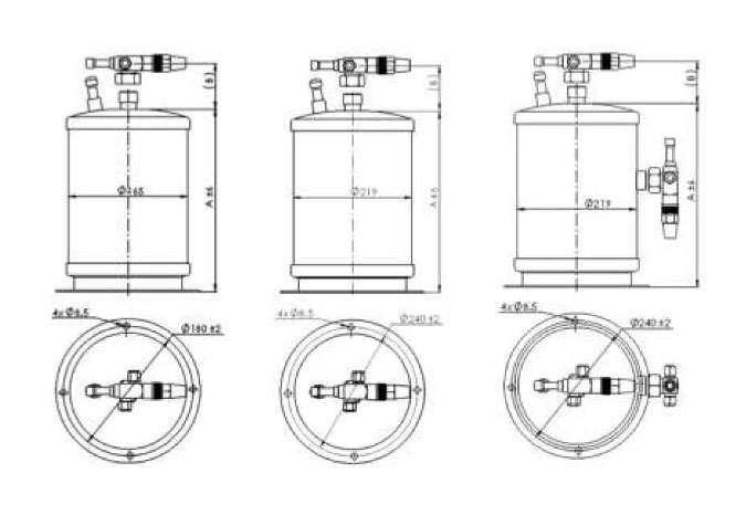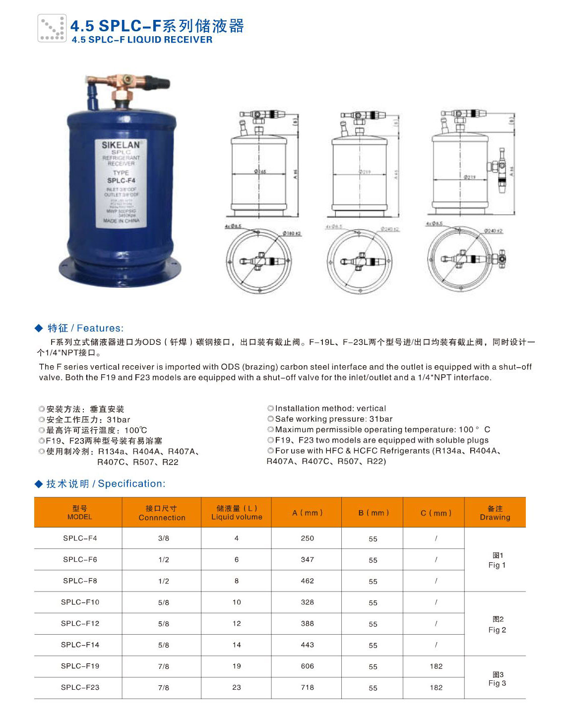 Product introduction:F系列立式儲液器進口為ODS(釬焊)碳鋼接口,出口裝有截止閥。F-19L、F-23L兩個型號進出口均裝有截止閥,同時設計一個1/4"NPT接口。