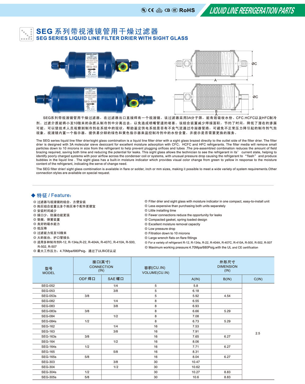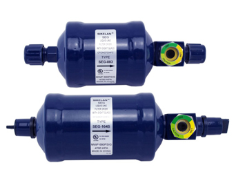 SEG系列帶視液鏡管用干燥過濾器,在過濾器出口直接焊有一個視液鏡。該過濾器采用3A分子篩,能有效吸收水份、CFC、HCFC以及HFC制冷劑。過濾介質能將小至10微米的雜質從制冷劑中分離出去,以免造成噴嘴管道的堵塞。該組合裝置減少焊接面積,節約了時間,降低了潛在的滲漏可能。可以使技術人員觀察到制冷劑在系統中的現狀,幫助鑒定供電系統是否有不良氣流通過冷凝器管路,可避免不正常壓力降引起的制冷劑氣泡現象。視液鏡內置一個指示器,提供易分辯的綠色和黃色指示器來監控制冷劑中的水份含量,并提示是否需要更換的服務。