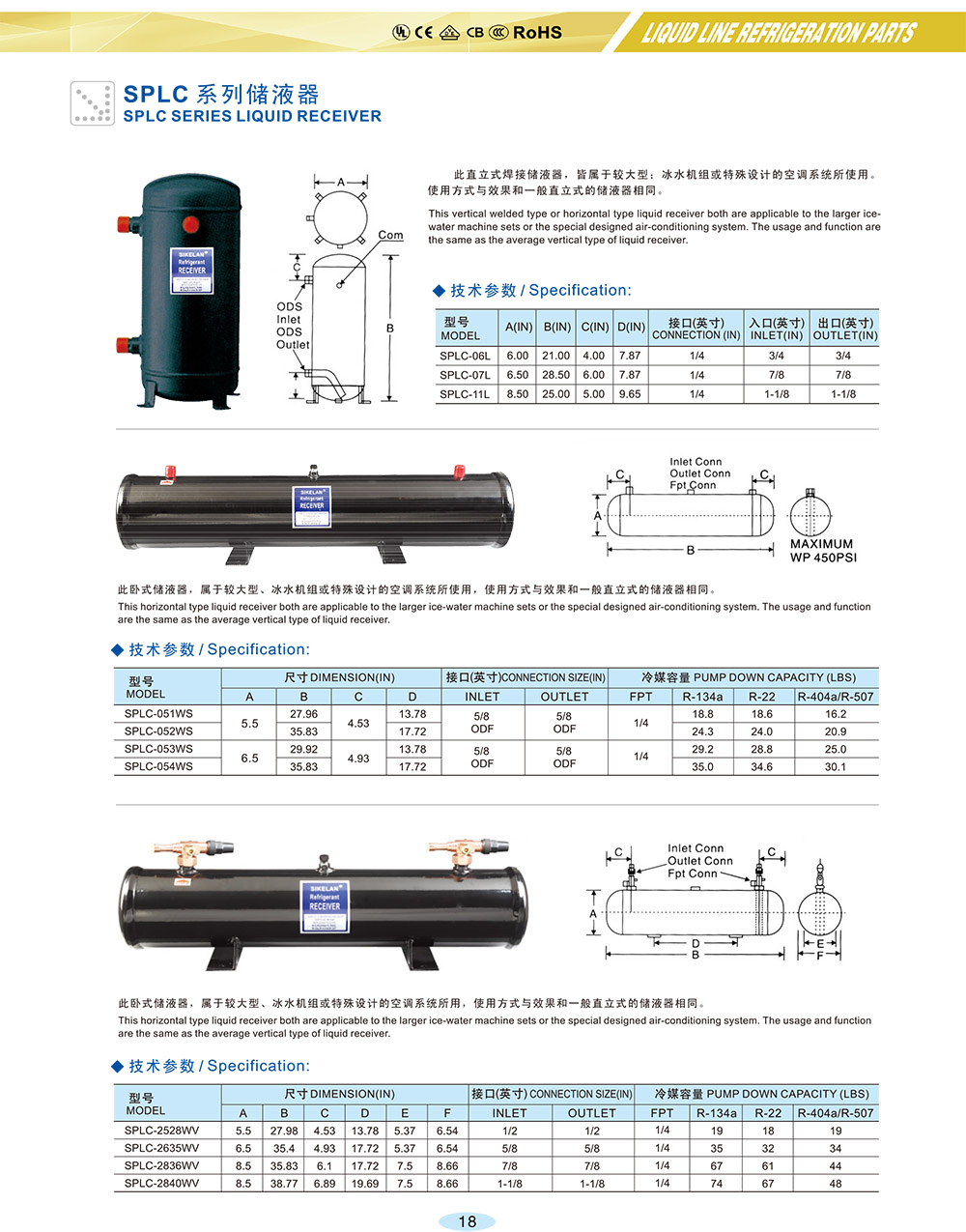產品簡介:此直立式焊接儲液器,皆屬于較大型、冰水機組或特殊設計的空調系統所使用,使用方式與效果和一般直立式的儲液器相同。