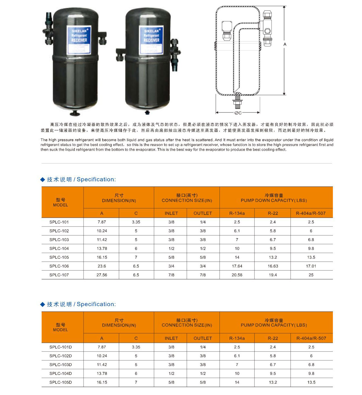 產品簡介:高壓冷媒在經過冷凝器的散熱效果之后,成為液體及氣態的狀態,但是必須在液態的情況下進入蒸發器,才能有良好的制冷效果,因此就必須裝置此一儲液器的設備,來使高壓冷媒儲存于此,然后再由底部抽出液態冷媒送至蒸發器,才能使蒸發器發揮到極限,而達到最好的制冷效果。