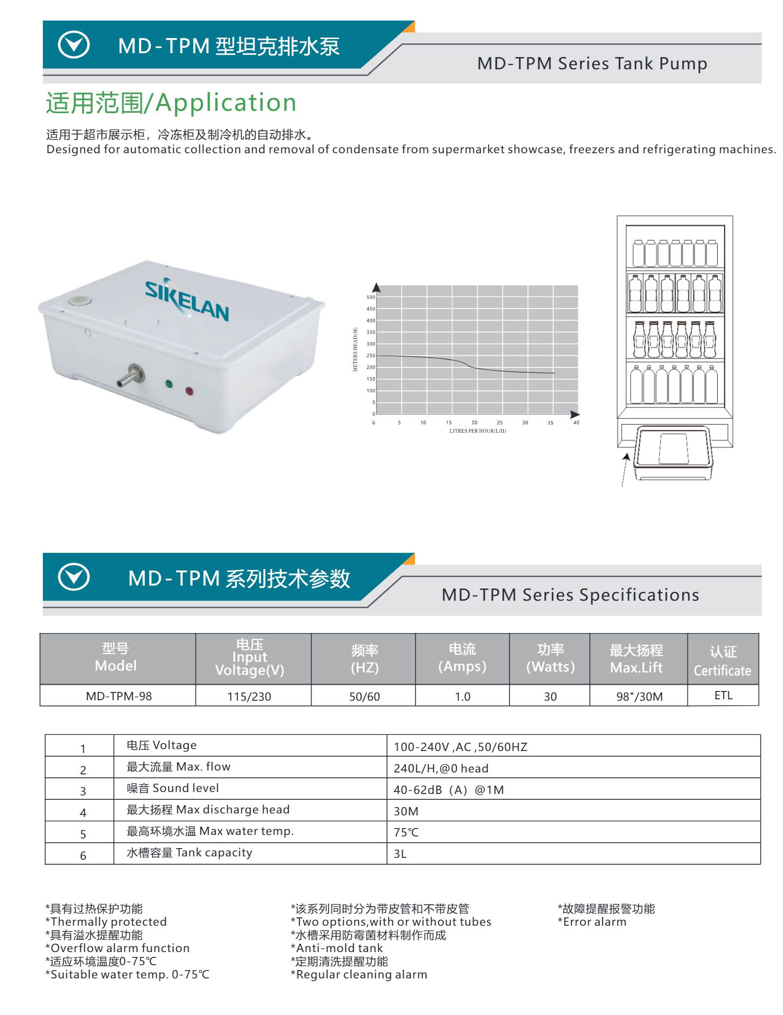 適用于超市展示柜,冷凍柜及制冷機的自動排水。