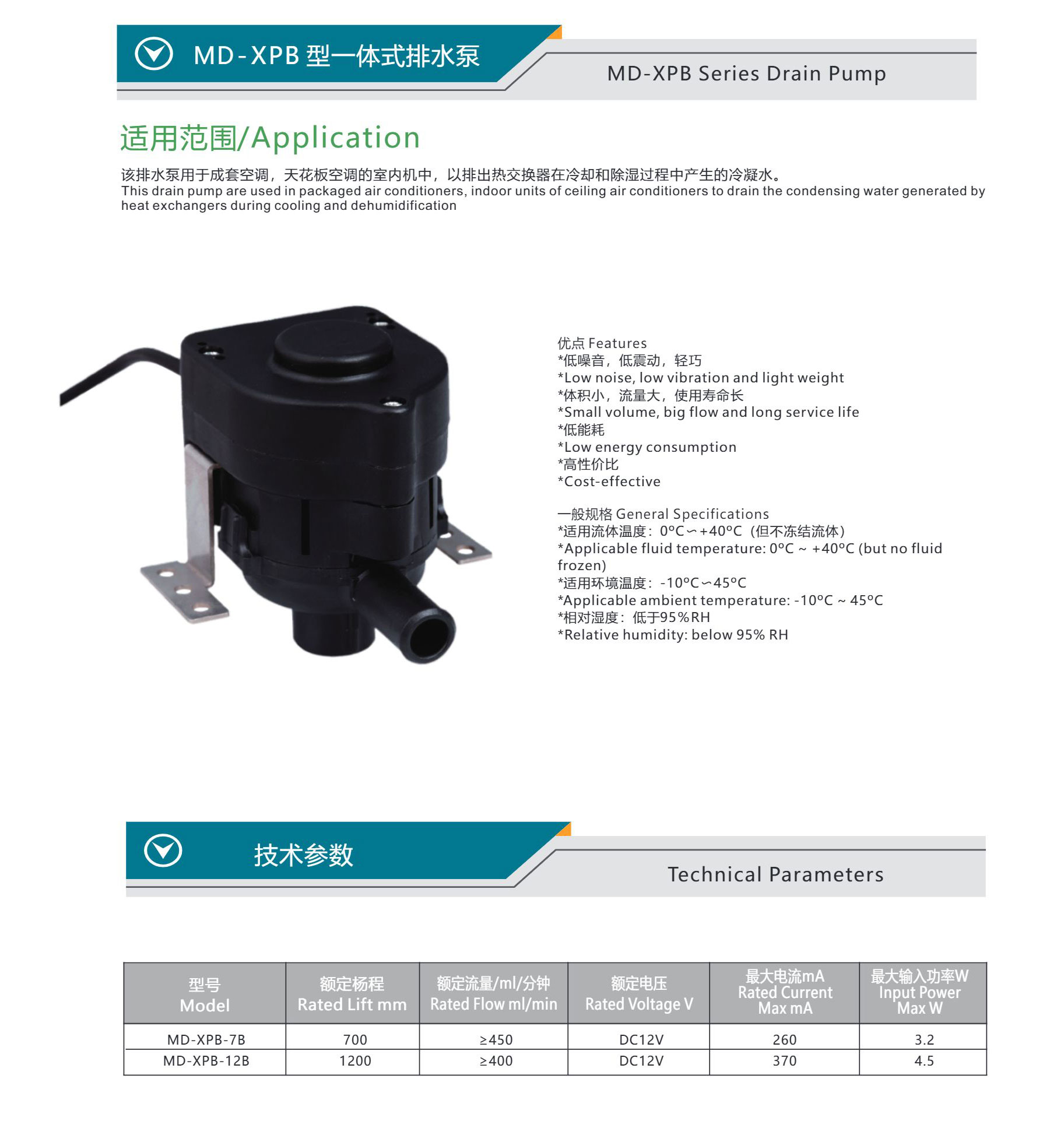 產品簡介:該排水泵用于成套空調,天花板空調的室內機中,以排出熱交換器在冷卻和除濕過程中產生的冷凝水。